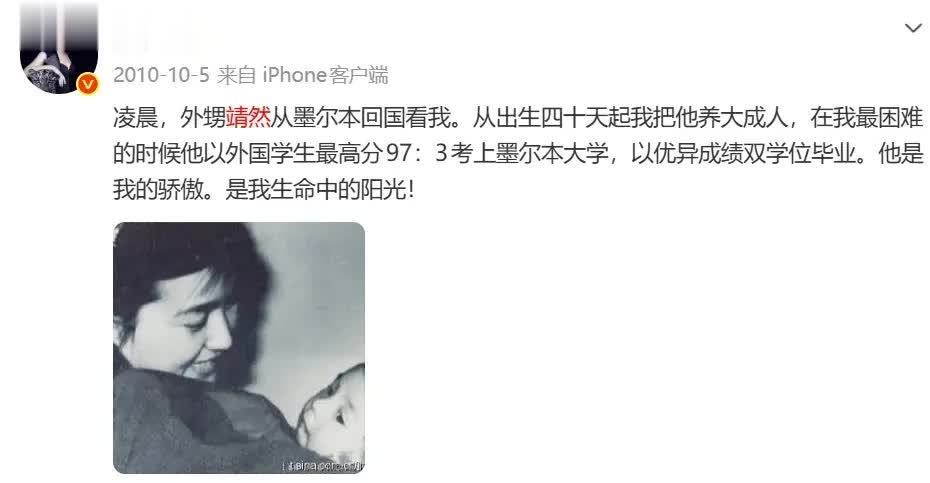 1985年,妹妹刘晓红生下儿子靖然,孩子才40天,就被刘晓庆接到身边亲自抚养。那时候她正当红,没有亲生子女,便把所有的希望,全都寄托在了这个外甥身上。